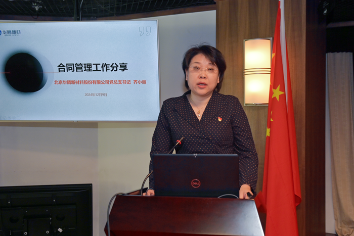 化研院党总支书记助理李志勇围绕制度体系建设和内控合规工作,华腾新材党总支书记齐小丽围绕合同管理分别作交流发言。