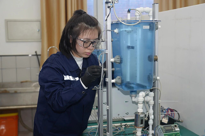 一滴水的旅程,关乎万家冷暖,关乎一方水土。当千家万户为春节团圆而举杯时,一群年轻人正在为守护那泓清泉背后的安全与生机而努力练习着。水处理技术项目实验室里,来自河南、山西等地职院的11名年轻选手,正凝神搭建着微缩的“城市水脉”。混凝、沉淀、过滤、消毒……一座现代化水厂的完整流程,在不足两平方米的操作台上正精密“上演”。选手赵可俯身调整管路,动作沉稳而利落。教练目光如尺,在她身后半步距离之内,衡量着她每一次操作的精度。在新任世赛水处理技术项目中国专家组组长柯瑞华和教练团的带领下,赵可和参加实训的10名伙伴,正在努力融会贯通化学、生物、机械、自动化等多学科知识,目标直指现代化污水处理厂的“总工程师”。春节前集训的日夜里,他们将反复演练从水质分析到系统检修的全套模块。